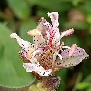 【紀伊上﨟杜鵑草】《ユリ科》 花言葉 「あなたの声が聞きたくて」 名前は 紀伊半島に生育することから 付けられている。 ジョウロウホトトギスに似ているが、茎はほぼ無毛で、 葉の両側の基部に耳片がある。 茎頂に1~2個、 上部の葉腋に1個ずつ花をつける。 ジョウロウホトトギスの変種または亜種という説もある。 *ジョウロウ(上臈)とは 上流の婦人、貴婦人の意味です。