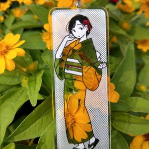 今日の大人のお遊び😊 お散歩ちゃんキーホルダー お散歩ちゃんキーホルダーは三人娘がアクリルのキーホルダーで洋服部分が透明なのでお花や景色など無限大に着せ替えて遊べちゃう 今日はメガネがチャームポイントでハイカラさんのかえでちゃん ゲンノショウコを合わせてみたよ