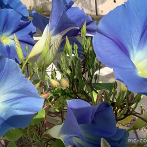 「朝顔たち💙」 昨日の朝は低いモッコクの木に、19もの朝顔たちが咲いていました。😉