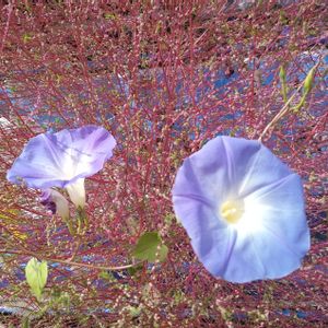 赤く色づいたコキア❤️ その上に顔見せ咲いたアサガオ💙 楽しい秋🍂と夏🏄️☀️🍧の競演🎵 🏷️木曜モフモフ 🏷️青い朝顔マニア 🏷️いつも心に太陽を🌞 🏷️楽しく元気に頑張ろう🤗 参加させて頂きます✨😌✨