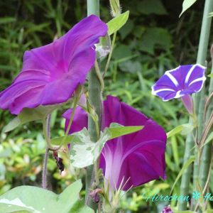 「庭の朝顔💠」 今年は、スーパーで大輪の💠タネを購入して一緒に蒔いて見たところ、紫色だけが先きに、咲きだしました。😊