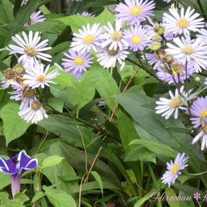 「シオンと朝顔」 朝顔💠は 昨年のこぼれタネから 、ぽつんとひとつ咲いているようです。😊