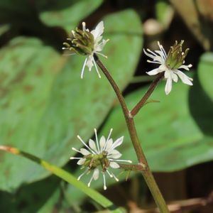 梅花黄蓮(バイカオウレン) キンポウゲ科オウレン属の多年草。山地の雑木林、森のやや湿った場所に生える。花期は3~5月。白い花弁に見えるものは萼片で、中心の黄色く小さな棒が花弁。 オウレンは黄色い根という意味。白梅の花に似るという意味でバイカがつく。葉はウコギ(五加木)に似て5つの小葉からなることから、別名は五加葉黄蓮(ゴカヨウオウレン)という。オウレンには本種の他に菊葉黄蓮(キクバオウレン)、芹葉黄蓮(セリバオウレン)などがある。 出典『四季の野の花図鑑』『野草の名前』