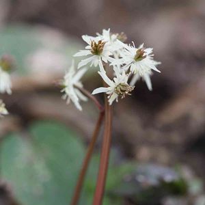 梅花黄蓮(バイカオウレン) キンポウゲ科オウレン属の多年草。山地の雑木林、森のやや湿った場所に生える。花期は3~5月。白い花弁に見えるものは萼片で、中心の黄色く小さな棒が花弁。 オウレンは黄色い根という意味。白梅の花に似るという意味でバイカがつく。葉はウコギ(五加木)に似て5つの小葉からなることから、別名は五加葉黄蓮(ゴカヨウオウレン)という。オウレンには本種の他に菊葉黄蓮(キクバオウレン)、芹葉黄蓮(セリバオウレン)などがある。 出典『四季の野の花図鑑』『野草の名前』
