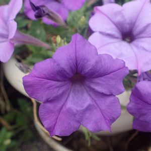 ペチュニア・ブルームーン 香りがあるのが特徴ということで、飛びついた品種です。香りは、期待したほど強くなかったし、想像していたのと少し違うかんじでしたが、花色もきれいなので満足はしてます(^^)猛暑で弱りかけたところで切り戻しておいたのが、また咲き始めてうれしい~(^^)v