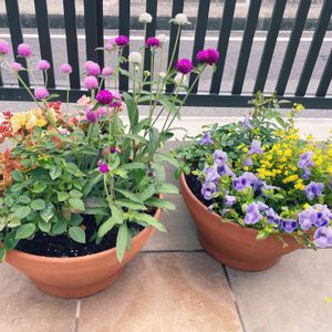 6月1日に購入した苗が大きくなってきました。青い花が咲くと思って黄色の花と寄せ植えたのですが紫色でした。 まっこれでもいいかっ。 青と黄色が正解というわけでもないし。