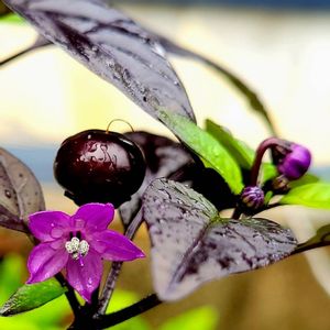 梅雨入りしました〜☔️ 観賞用トウガラシ ブラックパール💜 所々グリーンの葉っぱが可愛いです😍