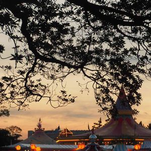 ディズニーランド ファンタジーランド 夕焼けに浮かぶ 大きな🌳のシルエットは 「ホルトノキ」 10月22日 撮影