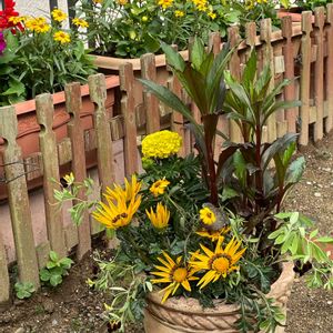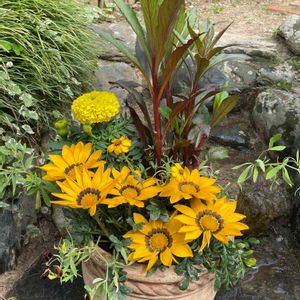 ガザニアの寄せ植え💛 黄色のガザニア、 マリーゴールド アフリカン、 小花のジニア を植えっぱなしの宿根ロベリアと いっしょに寄せてみました。 東側の長鉢も、夏に向けた お花達に植え替えました。