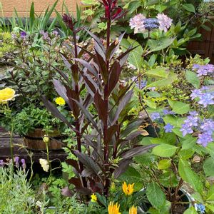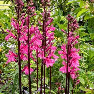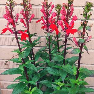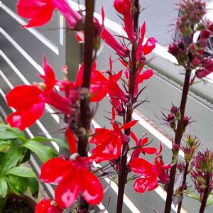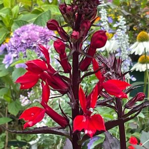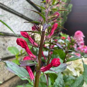 ❤️宿根ロベリア❤️ スターシップ・スカーレット くすんだ緑葉と銅葉に深紅お花が咲いてる 冬越し2年目でも、次々と花芽が上がって楽しみ〜なお花 去年、次男の家の近くのHCにたまたま寄った時に目に止まっちゃった😍😍 スーッと背が高くて妖艶な色のお花に一目惚れ あの小さなロベリアのお花をでっかくした形❤️❤️❤️ 下向きにヒラって可愛い🎶 手間要らずないい子ちゃん なんつっても、置き場所変えても文句言わない従順さ✨ 花期も長く、梅雨を乗り越えて秋まで咲き続ける✨ 花後、秋に下葉まで切り詰めたらほったらかし✨ 春になったら、ワッサワサの葉っぱになって、6月に入ると花芽がググーン✨ 梅雨の合間の薄曇りの今日は、真っ直ぐな茎が空に向かってた! 梅雨明けまで頑張れって励ました👍