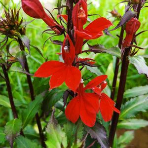 宿根ロベリアの、開花。 雨がやんで、庭に出たら、 な、なんと咲いているではないですか‼️ この、鮮やかな朱色。 ブロンズ色の葉、茎に、 なんとも、艶かしいお姿😍