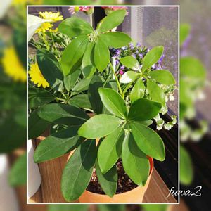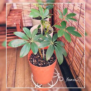 写真は我が家の秘蔵っ子 歌って踊れるシェフレラ・コンパクタ☆ 盆栽仕立てで生育中。 購入当初は樹形が左に流れてましたが、 剪定して上に伸ばしてます。 様子見て切り戻す予定です。