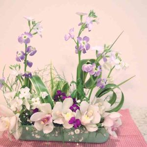 🌼ラン、ストック、ナデシコ、カスミソウ、アカシアのアレンジメント🌼 ランを中心にして小さなお花をチマチマさして、とっても優しい雰囲気💞 ファーマーズマーケットで全部買えたのでお安く出来上がりましたよ~🎶 1000円もかからず、花材が余ってもう1セット出来そう🎵