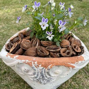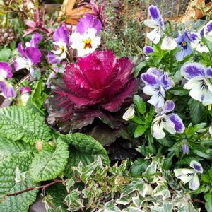 12月に寄せ植えしたプランター 育種家さんのビオラ 碧いうさぎとモココ 葉牡丹のまわりを跳ねてます‼️ 雪が積もったり、激しい風に煽られたり~💦 厳しかった冬を乗り越えて⤴️⤴️ もう雪降らないと良いけど。。。
