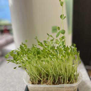 豆苗を育てています🌱 1ヶ月前に寄せ鍋に入れて あとをパッケージに書いてあった通りに毎日お水をかえています。 もっと伸びが早いと思っていたけどこれで1ヶ月です。 日の当たる台所の出窓に置いています。