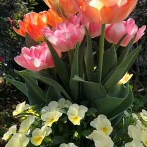 花束植えをしたチューリップ 火曜日にほんのり色づき始めてからお天気に恵まれ、 一気に咲き進みました。 優しかったレモン色は明るいアプリコットカラーへ ピンクも色鮮やかになりました。 八重咲きチューリップの可愛い花束♡ 母の抱えるような仕草に 笑顔がこぼれる休日でした。 𖤣𖥧𖥣𖡡𖥧𖤣 チューリップ ダブルデッカー 𖤣𖥧𖥣𖡡𖥧𖤣 2021.11.7投稿 植え込み 2022.3.6投稿 芽吹き 2022.4.5投稿 ほんのり色づき♪
