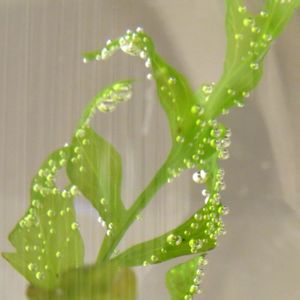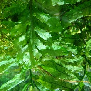 水性シダ 深い緑ですが透明感があります。 うちの水槽は週に一回水かえしてます。取り替えた水は、そのまま観葉植物達へ。 魚達の排泄物がいい栄養になるかと期待してるのですが目立った成果がわかりません。25度の水温なのでチランジアのソーキングには良さそうです。