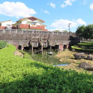 立田輪中人造堰樋門 輪中の用排水管理を目的として、立田輪中普通水利組合が明治34(1901)年に完成させた樋門。石灰と土を使った人造石工法で作られており、現在は遊休樋門で、輪中公園の中に保存されています。