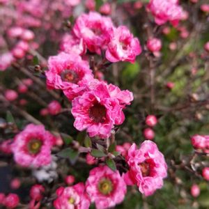 今日のお花🌸ギョリュウバイ この花は 硬くて小さく先端が尖った葉が ギョリュウ(御柳)の葉に似て、 花が梅花に似ているところから 和名を「ギョリュウバイ」と 呼ばれるようになりました。 原産国ニュージーランド🇳🇿🥝🐄の 国花であり、 葉をお茶☕に使うことから、 ニュージーランドティーツリー 「Tea tree」と呼ばれています。 学名 Leptospermum scoparium 「レプトスペルマム」はギリシャ語で「薄い種子」の意。ネズモドキ属。 「スコパリウム」は箒状の意。 暖地では 花期も長く、とても丈夫で育てやすい植物です。 日本には戦後輸入され 蜜源🐝🍯(マヌカハニー)として 好まれて栽培されています。