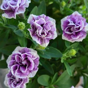 桂楓園さんの八重咲きペチュニア ライラックフェアリー 大好きなルーシーグレイさんでお名前つけられた八重咲きペチュニア ちょこちょこカットしながら育てたら枝垂れる部分もカットしちゃってたかも😓 でも今が一番きれいかな✨ ➁ベインがきれいに入ってフチにちょこんとグリーン💚 ➃全体 枝垂れるように周り残せばよかった〜 ➄真夏でもがんはってるペチュニアたち