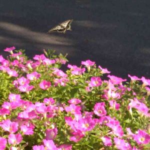 三尺バーベナ アゲハチョウ 駐車場の三尺バーベナ。 満開! アゲハチョウが遊びにきたよ。 あちらの花から、こちらの花に、ひらひらしながら、移ってた。 あこがれのコラボだよ! 又ひとつ、夢がかなった。 しあわせ!