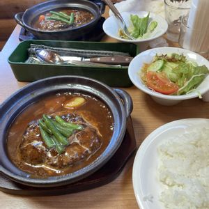 💕熱中症みたいと ほざく嫁(家内) 栄養補給にランチデート💕 番外編 朝からジリジリと照りつける太陽☀️ 庭先の温度計は45℃ 👩 嫁曰く 「私は熱中症になったでしょう! 栄養を取らないとダメみたい」 😎 「いつ、どこで、誰が???」 嫁の勢いに負けてランチを食べに 行って来ました🥵💦 初雪かずらの花壇のあるレストラン この暑いのに煮込みハンバーグを ふうふう言いながら食べました 我が家の嫁 まだ太りたい様です🤣