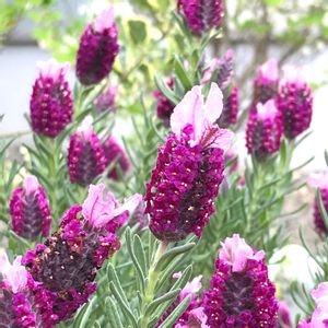 今日のお花、ラベンダーです。これは、ストエカス系(フレンチ系)の園芸品種で、コンパクトでコンテナ向きの、シフォン・花うさぎ、小さめの白い旗弁がかわいらしいです。ラベンダーとして、薫り高い香油を多く含むイングリッシュ系は暑さに弱くてわが家では持ちませんので、うちにあるラベンダーのほとんどがストエカス系です。