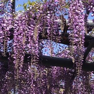 青天の下、藤色の「ノダフジ」が映えます。クマバチさんがたくさん飛んでいます。📸🍇🤍🌿😊😄🌞✌️