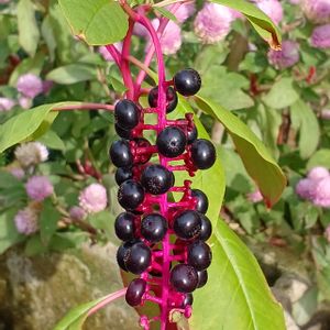 ヨウシュヤマゴボウ(洋種山牛蒡) 花言葉👨🌾『野生』『元気』『内縁の妻』 洋種山牛蒡は北アメリカ原産の帰化植物です 。山野や 街中、 庭や花壇の植え込み 、アスファルトの割れ目まで、あらゆる所で力強く 生息しています。 ごぼうの仲間ではありませんが、根がごぼうのように長いことから、この名前がつきました。 洋種山牛蒡は根元から枝分かれし、横幅のある大きな株になります 。草丈も高く、放っておくと人間の身長を越すほどです。 夏になると濃いピンク色の枝の先に、小さな花穂を咲かせます。 夏に咲いた洋種山牛蒡の花は 、秋にぶどうのような房状の果実をつけ、熟すと黒くなります。 この黒い果実をつぶすと、赤紫の果汁が出てきます。 洋種山牛蒡の赤紫の多重は服に付着すると通常の洗濯では取れない頑固なシミとなって残ります 。洋種山牛蒡の実を触るときは 淡い色合いの服は着用しないのが賢明です。