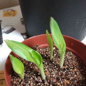 【1枚目】種まき11日目になる空芯菜は双葉が展開して、早いものでは本葉も見えてきました。双葉がチョキ✌️の形なの、可愛い🤭 ちょっと偏っちゃったから多いところから移そうかなと思って直根性かどうか調べたら、空芯菜ってヒルガオ科なんですってね。知らなかったわー😳 植え替えはそーっとやれば大丈夫のようです。そもそも強いからね👍 たくさん発芽したから植え広げる手もありますが、そんなにたくさんあっても食べ飽きるから間引きしようかな😗 【2枚目】こぼれ種を拾った葉牡丹はそこそこ成長しています。 昨日、2cmくらいに成長した青虫を見つけて捕殺しました。危ない危ない💦 昨年のこぼれ種は7月24日には虫に食われ茎だけになって終了しましたが、今年はどうなることやら?🙄 【3枚目】6月26日に葉牡丹リースから救出した葉牡丹は現在こんな感じ。虫に食われてますね💦 どちらの葉牡丹もオルトランDX粒剤はたっぷり蒔いたけどそれだけじゃおそらく間に合わないので、薬剤スプレーも併用するべきなんですがサボってまーす😅 【4枚目】7月7日に種まきした矮性カンナ・サウスパシフィックローズは現在こんな感じ。結構のんびりさん? 9月後半くらいから咲いてくれるかなと思って蒔いてみたけど、ちょっと難しいかもしれません。まぁ咲かなかったら来年に繰り越しで。 【5枚目】7月7日に投稿したミニバラ・グリーンアイスは現在ほぼグリーンになり、背景と同化しつつあります🤭 ちょっとずつ咲き続けていたので枯れたら花首だけカットしていましたが、そろそろ咲き終わりっぽいのでまとめて剪定しちゃおうかな✂️ 今日も暑いですねー🥵 そろそろ葉牡丹の種まき準備しなくちゃですが、こんな暑い中に大丈夫かしら?🤔