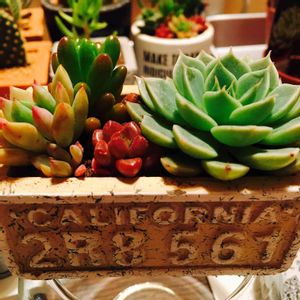 台が手のひらサイズのミニチュア寄せ植え⌄̈⃝ 左が縦に伸びる多肉ちゃん♪♪ 右がセダム属♪♪でまとめてみたよ( ˊᵕˋ )