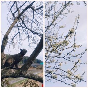 わが家のサビ猫 (迷い猫)と咲き始めのすももです。やっと春が…山里にも!