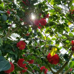 😄こんばんは❗️ 今日も良い天気でしたので🌺久留米の『世界のつばき館』とすぐ近くの『久留米つばき園』へ行って来ました✌️ この写真は、世界のつばき館から久留米つばき園へ行く途中の草野小学校の校庭に綺麗に咲いていた椿です😙(左上が全体像) 同じ木にこれだけのお花が咲いてて、とっても綺麗でしたよぉ〜😉