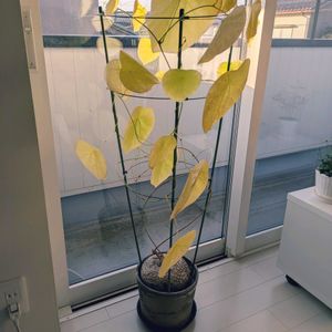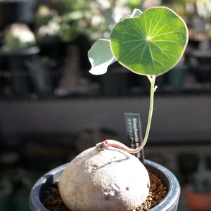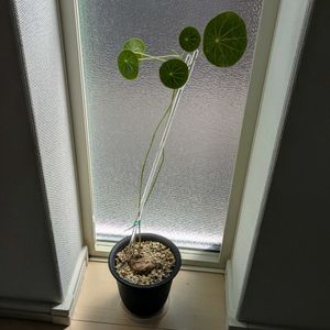 ミルクランドお迎え戦利品3つ目 ステファニアエレクタ!! 最後にウロウロして見つけた一目惚れさん😍💘 なんですか!この芋は🍠 可愛い💕 葉っぱも可愛い💕 全部可愛い💕 この子は塊根植物で、観葉植物ではないんですが、レースのカーテン越しで育ててます🥰