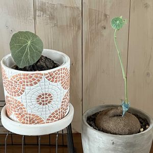 ステファニア カウィーサキー やったー🎉 1枚目、葉がどこにあるか分かりますか!?😂 パッと見この芋の一番頂上から芽が出ると思ってたんだけど …まさかの脇っちょから出てました 一日空けて見てみたらこの状態、 出てくるとこ見落としてたー! しかも下向きでイモの埋め方が間違いか悩んだけど、根はちゃんと生えてたので大丈夫なはず😂 意表を突いた発芽でした まだミニミニなのにこの葉脈の色✨ 主張してきますね、成長楽しみ♪ 4.丸葉達集合🌀 かわいい植物見つけました! シーグレープ、私初めて〜😍 ウンベラータみたいに仕立てられるみたいなので、もうちょっと大きくなったらワイヤーやっていきます🥰 手前ステファニアエレクタは少し葉が大きくなってきました🥹 が、が、が、、、 水やりで鉢を移動した時に 別の鉢を動かした時にひっかけ…… 根元から……ポキ…😭🤣 かろうじてくっ付いてるので またマスキングテープで養生してます🤣 はぁ……ふぁいと…✊🔥