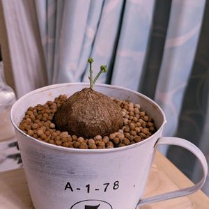 我が家の寝坊助 ステファニアエレクタさん 外に出したらやっと起きる気になった様です だがしかーし❗️ そんなところから芽を出す気?🌱 3カ所から緑が覗いてるよ? 頭の上からじゃ無いの??? 私と一緒で変な子だね どう育っていくか楽しみでもあるけどね🥰