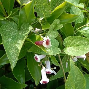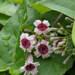 スイカズラの葉に絡まる 早乙女花(ヘクソカズラ) お花(1㌢程) 、蕾(横見1㌢程)、 実(5㍉程) 🏷サオトメバナ図鑑 に、初サンカ∩(๑⃙⃘'ᗜ'๑⃙⃘)∩シマス よろしくお願いします。🙇♀️