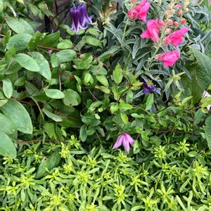 本日2投稿です 今日のお花 斑入り葉っぱの金魚草とクレマチス