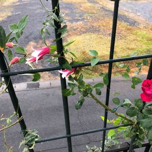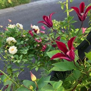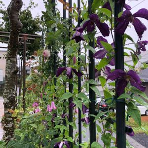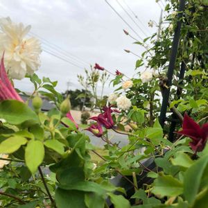 道路側にフェンスから飛び出して咲いている クレマチス グラブタイビューティ つるバラ アリスターステラグレイ