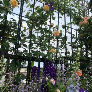 カラフルなお庭 バラが開花してフェンスが毎日カラフルに まだ数種類のバラが蕾 まだまだこれから華やかになっていきます デルフィニウムの一番花はカットをするので雰囲気が変わるかな その変化が楽しくて🎶