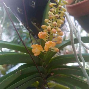 (Vanda miniata × Rhynchostylis coelestis) 先端の一輪の開花を待っていたら 今朝上部の数輪しおれてました。 結局最後の一輪は咲かなそう😅 メモ 花はミニアタを大きくした感じで花の形はセレスティスより 香りもありセレスティスと同じ匂い ただセレスティスより花が小さいせいなのか香りは弱い