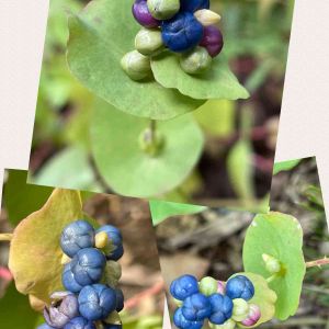 朝🐕散歩 イシミカワの実 地を這うように のびていました 葉の位置を少しずらそうとしたら イタターー‼️😫 こんなに小さいのにトゲはかなり鋭いです〜注意❗️ いろんな色と形があり多彩な実ですねー🔵