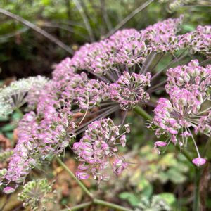 10/1 朝🐕散歩 シシウドの花後 果実をつけた花序。種子のように見える果実は楕円形で、周囲に薄い膜のような羽がついており、風で飛散する。しかし、飛距離は数メートルから十数メートル程度で、遠くまでは飛散しない。そのため、繁殖力も強いことから群生をつくりやすい。 wikipediaより 先月花火のような白い花を投稿しましたが花の後の 新しい果実はピンクのお花のようでした
