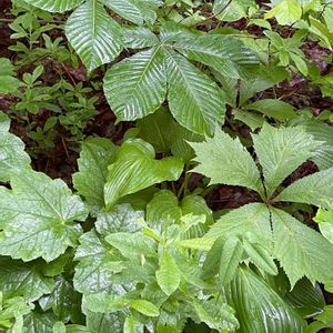 この葉っぱ達🌿何種類の植物があると思いますか?? トチノキ オオバショウマ ギボウシ ヤグルマソウ ワレモコウ ツツジ科の何か? もっとあるかも?😆 この狭いスペースですが これからも ワクワクして見て行きます💕