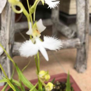 小さく精巧な作りに見入る ブレビフォリウムかな? 室内用に買っておいた鉢植えのコ 外のコは葉がモリモリで花が咲く気配無し