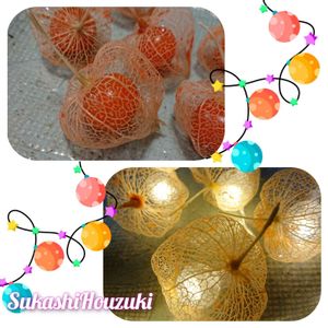 初めてのすかし鬼灯作り✨ なかなか綺麗に透かせなくて、取り残しあるんだけれど、もう待てなくて今回はこれで完成にしてしまいました 。 まだオレンジ色になっていなかった緑の鬼灯も一緒に水に浸けて分かったことですが、オレンジ色のも成熟していない部分の皮は取れづらかったので、きちんと成熟した鬼灯で作るのが良いことが分かりました。 セリアでこんなライトが売っていたので中に入れてみたら可愛い出来上がり💕 来年は、畑の鬼灯もっと育ってから作りましょう😉