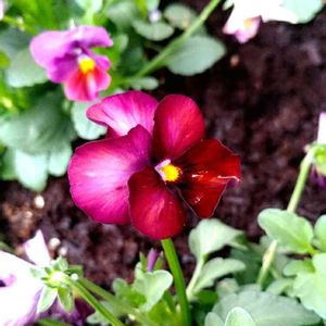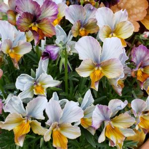 ビオラが育ってます😊 おしゃまなケリーは右と左で色味が違います。右の方が青い色が強くて、それもまた素敵です🥰 ヌーヴェルヴァーグは、お花が増えてフリフリの盛モリ👍株も大きくなってきました。