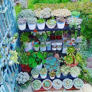 こんばんは🍻 捨てるつもりで外に出しておいたオンボロの錆びたスチール棚で半日陰にコーナーを作り、休眠中のアエオや 弱って養生中の多肉を並べてみました。 上段を除き 午前中だけ日が当たります。 風通しも悪くない‼ この棚を置くために、ドウダンツツジの植え込みをクランク状に刈り込み。 ちょっと可哀想だったかも…😅