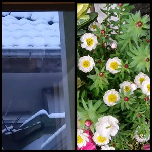 全国 寒波襲来 朝 起きたら 積もって ました。 寄せ植え 花かんざし 陽射しの時に撮りました。 こんにちは😊 陽射しは ありながら チラ チラ 降ってます。