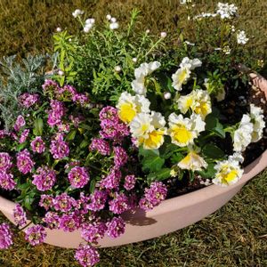 年末に寄せ植えした子達です。 花かんざし(奥)ビオラ(左)ラナンキュラス(右)アリッサム(手前) 黄色のラナンキュラス💛の上側 傷んだ花びらを取ったので、ちょっと残念な感じになってしまいました。 アリッサムの白も可愛いですが、花かんざしも清楚な感じで良いですね😍 ビオラ💜のフリルが良いなと思って買ったのに俯いて残念😅 親バカだもん❣️どれもやっぱり可愛いな🥰💕💕